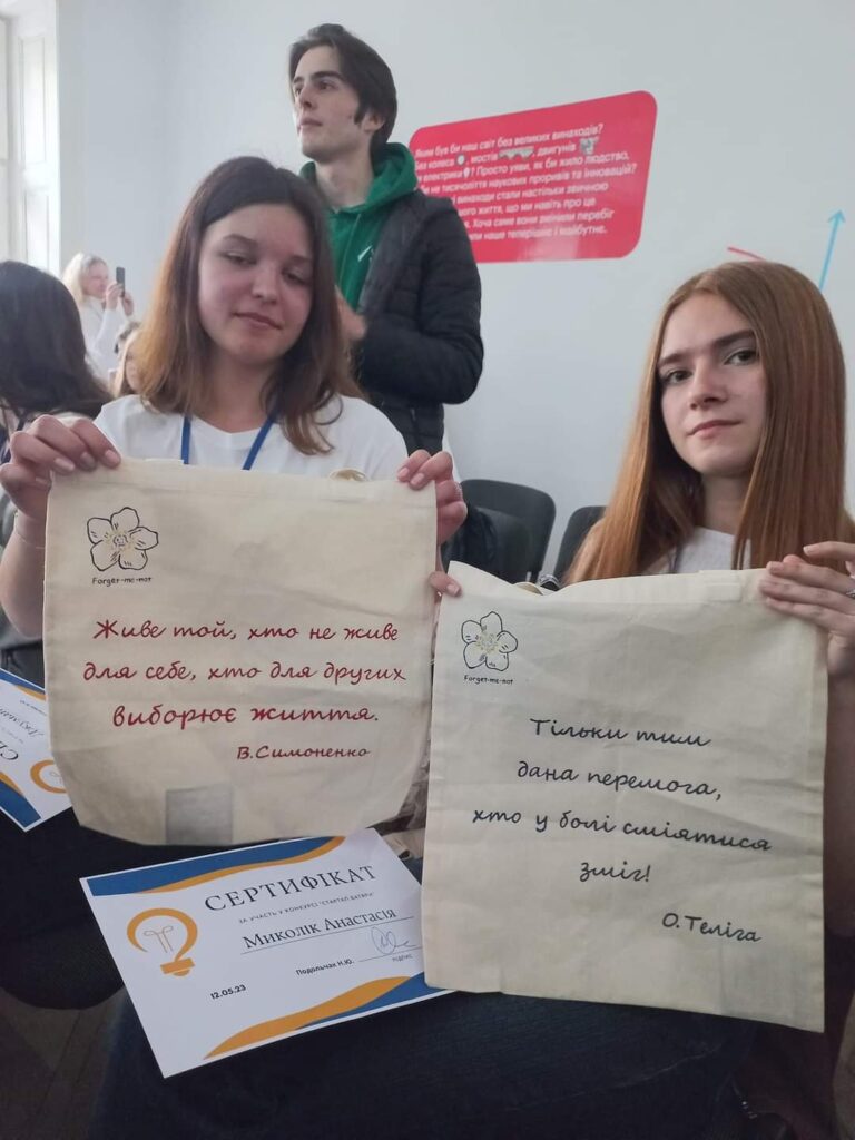 ●ІІ-місце, проєкт “Forget-me-not”(еко-торбинки, “Незабудка”) ЛВПУТС, Карпова Софія, Злиденна Поліна, Джуман Віолета, Миколік Анастасія ( проєкт в рамках курсу «Компанія» від Junior Achievement Ukraine);
